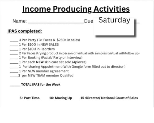 File away your recent customers, leads, potential team members, and any tasks into the correct day to follow up with.Example: Whatever is in the "Tuesday" folder is all you must focus on for Tuesday. Follow up with Susie on the product she purchased two days ago, then move her profile card to 2 weeks out or: Next Month: write a note/ sticky note with any memos to remember.
